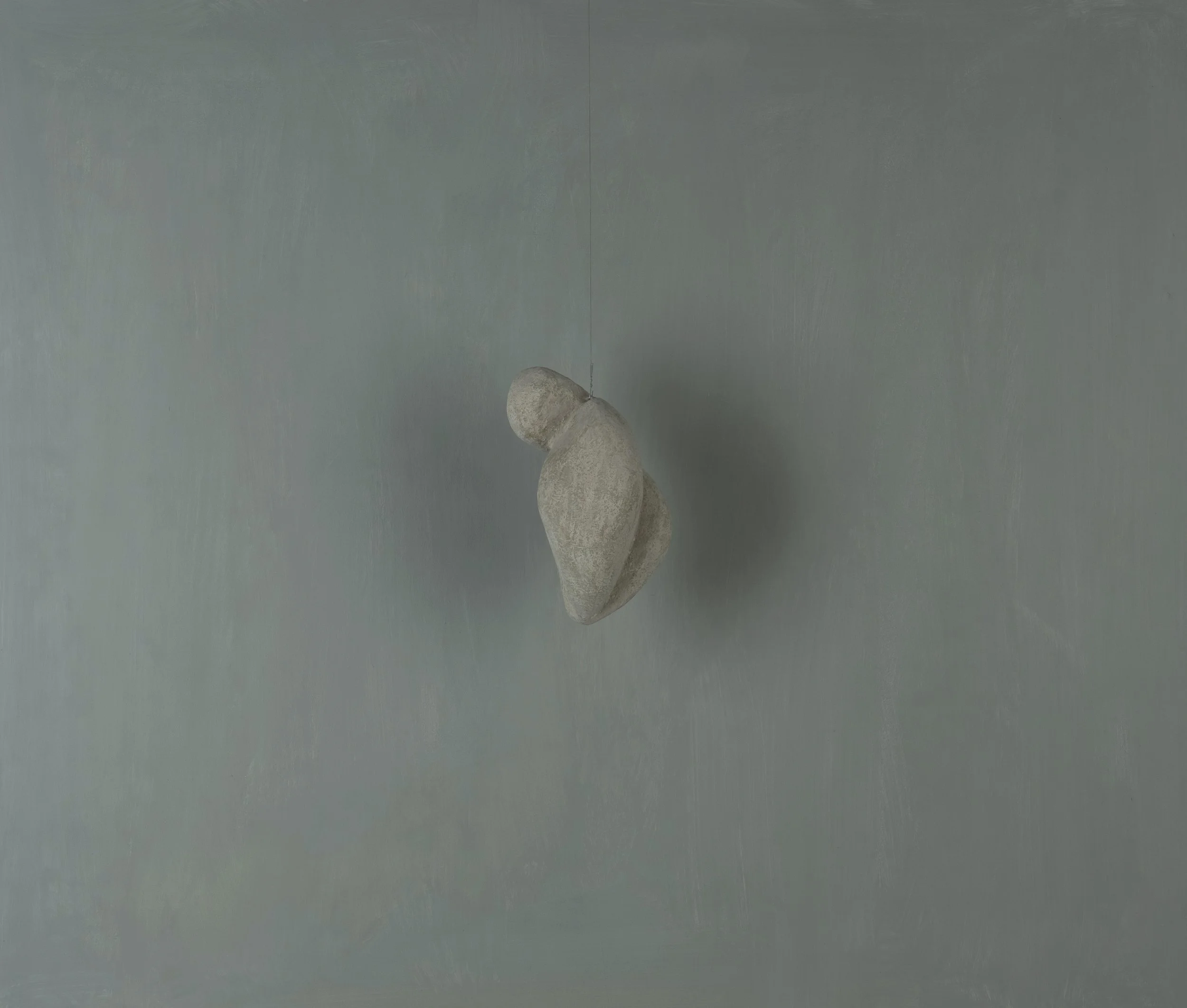 L'installazione artistica di una scultura sospesa a forma di corpo umano, realizzata in materiale grigio con superficie ruvida, appesa al soffitto con un filo.